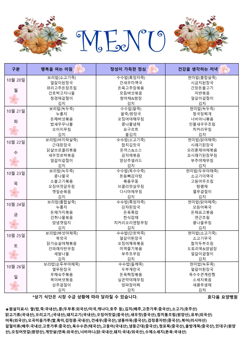 10월 20일~10월 26일 식단표 페이지 정보 작성자 효다움요양병원 댓글 댓글 0건 조회Hit 5회 작성일Date 25-10-17 15:03 본문 . 목록 답변 다음글10월 13일~10월 19일 식단표 25.10.10 댓글 0 댓글목록 등록된 댓글이 없습니다.